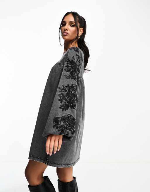 ASOS DESIGN embroidered long sleeve smock mini dress with washed gray