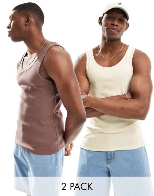ASOS DESIGN essentials 2 pack muscle tanks in pink and cream rib