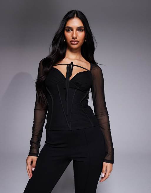 ASOS DESIGN exposed seam mesh long sleeve top black