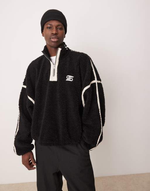 ASOS DESIGN extreme oversized boxy fleece sweater with half zip and embroidery in black borg