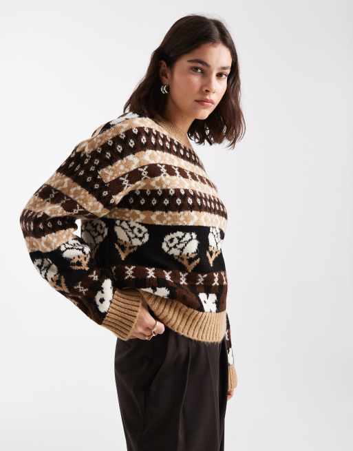 ASOS DESIGN Fairisle patterned sweater in brown and buttermilk