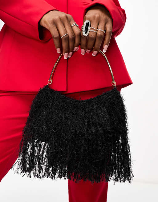 ASOS DESIGN faux feather clutch bag with gold handle in black