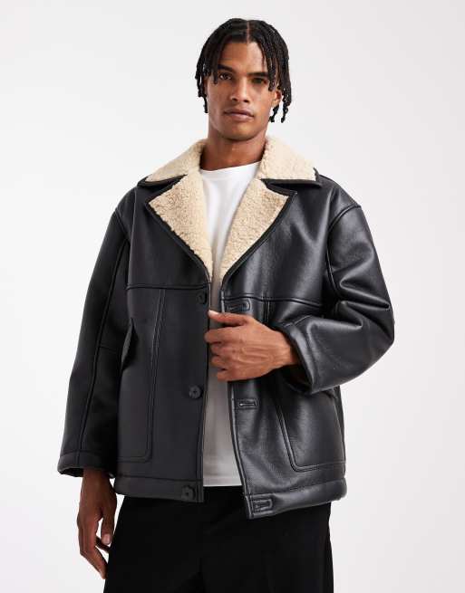 ASOS DESIGN faux leather aviator jacket with borg lining in black