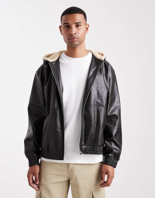 ASOS DESIGN faux leather bomber jacket with teddy lined hood in black