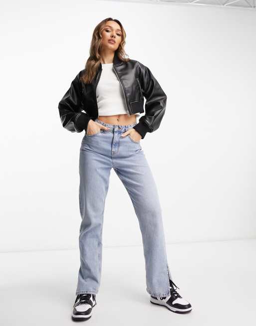 ASOS DESIGN faux leather cropped bomber jacket in black
