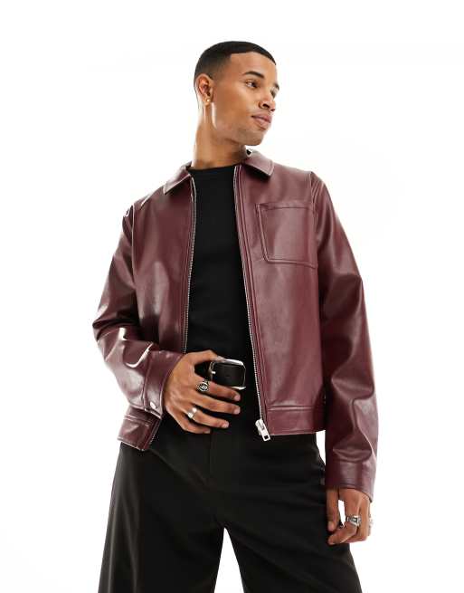 ASOS DESIGN faux leather harrington jacket in burgundy