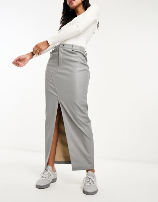 ASOS DESIGN faux leather maxi skirt with front split in gray