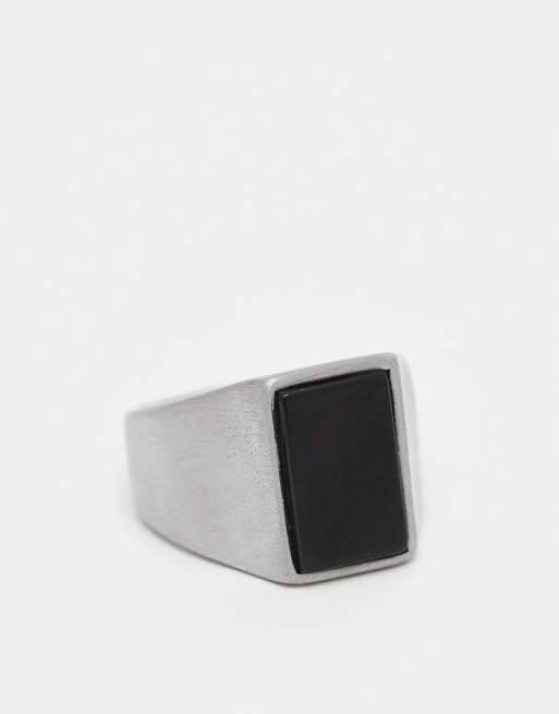 ASOS DESIGN festival waterproof stainless steel semi-precious black agate stone signet ring in brushed silver