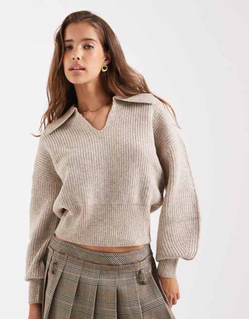 ASOS DESIGN fisherman rib knit polo shirt with waisted detail in oatmeal