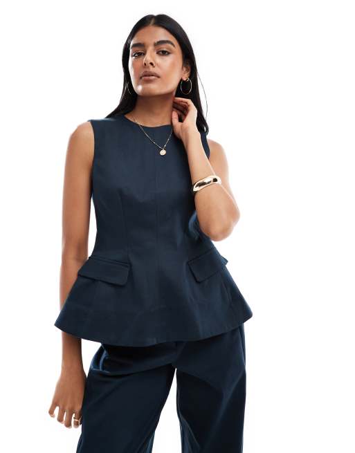 ASOS DESIGN fitted peplum top with tab detail in navy - part of a set