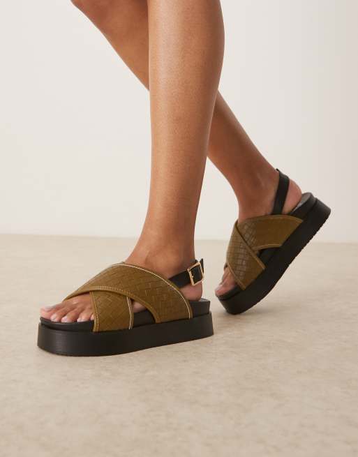 ASOS DESIGN Flame woven cross strap footbed sandals in olive green