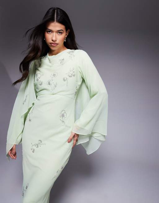 ASOS DESIGN floral embellished cape detail bias cut maxi dress with cowl neck in sage green