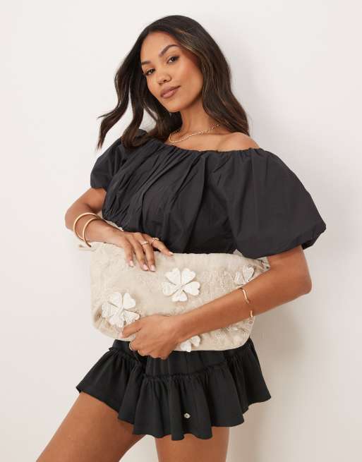 ASOS DESIGN floral embellished ruched pouch clutch in natural