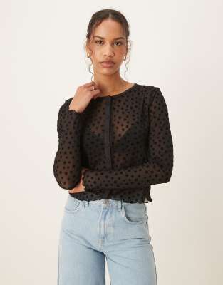ASOS DESIGN floral flocked mesh button up long sleeve top in black