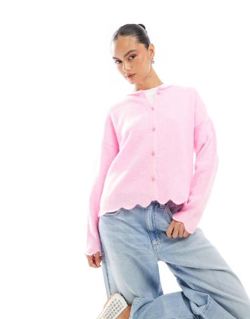 ASOS DESIGN fluffy knit cardigan with scallop edge in pink