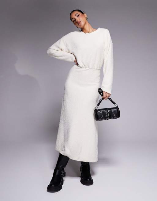 ASOS DESIGN fluffy long sleeve blouson midi dress in cream