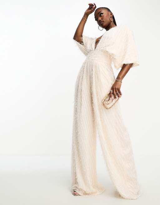 ASOS DESIGN fluffy plunge jumpsuit with wide leg in blush