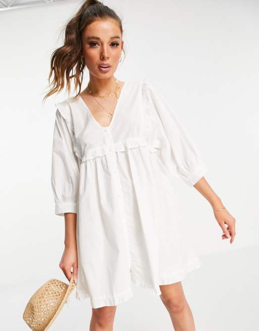 ASOS DESIGN frill v neck cotton button through mini smock dress in white