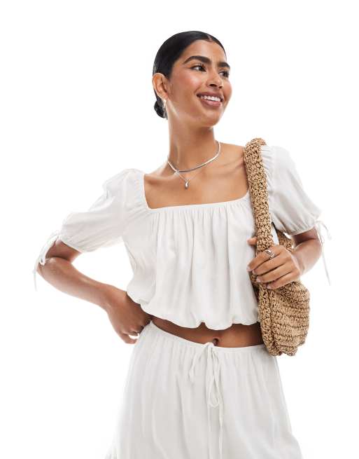 ASOS DESIGN gathered neckline puff sleeve blouse in ivory