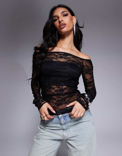 ASOS DESIGN gathered off the shoulder mesh top in black lace