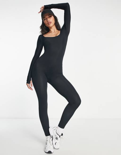 ASOS DESIGN glossy unitard jumpsuit with thumb holes in black