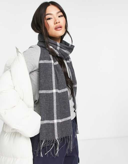 ASOS DESIGN grid plaid tassel scarf in gray
