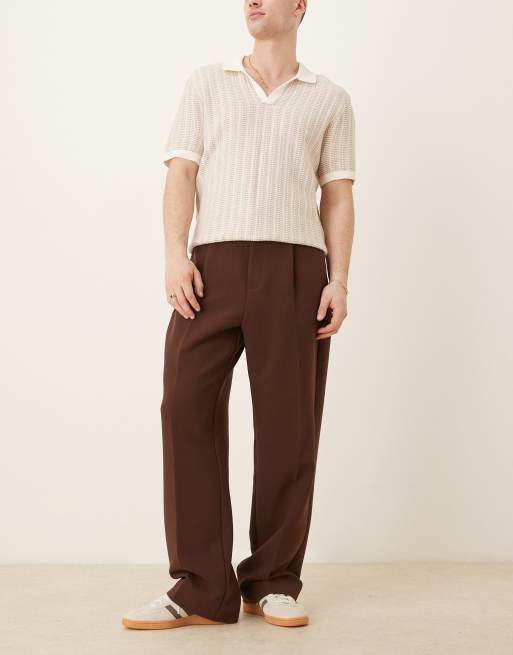 ASOS DESIGN half elasticized wide leg dress pants with front pleats and chunky belt loops in brown
