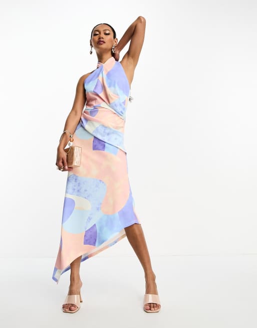 ASOS DESIGN halter draped midi skater dress in pink and blue smudge print