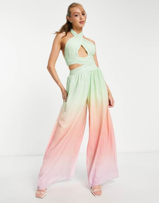 ASOS DESIGN halter ruched jumpsuit with cut out in ombre