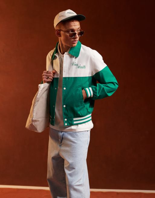 ASOS DESIGN Harrington jacket with embroidered stitch detail in white and green