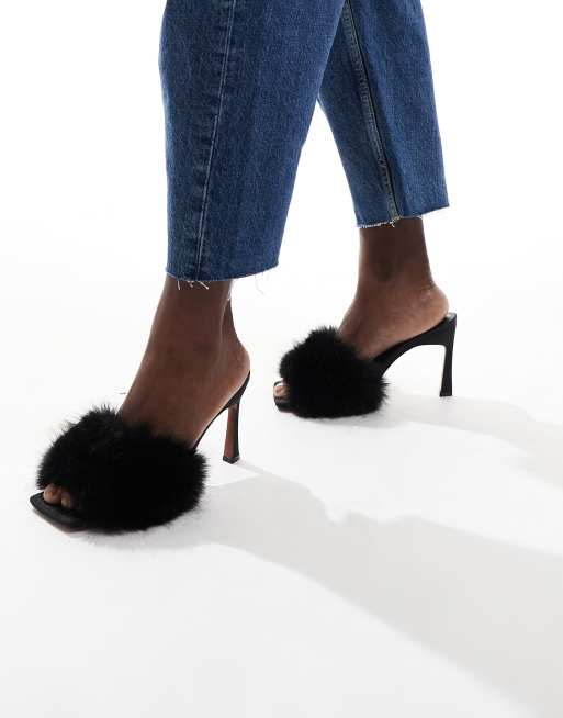 ASOS DESIGN Heartbreak fur mid heeled mules in black