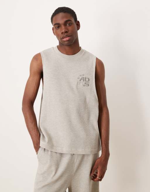 ASOS DESIGN heavyweight boxy relaxed tank with chest embroidery in beige waffle - part of a set