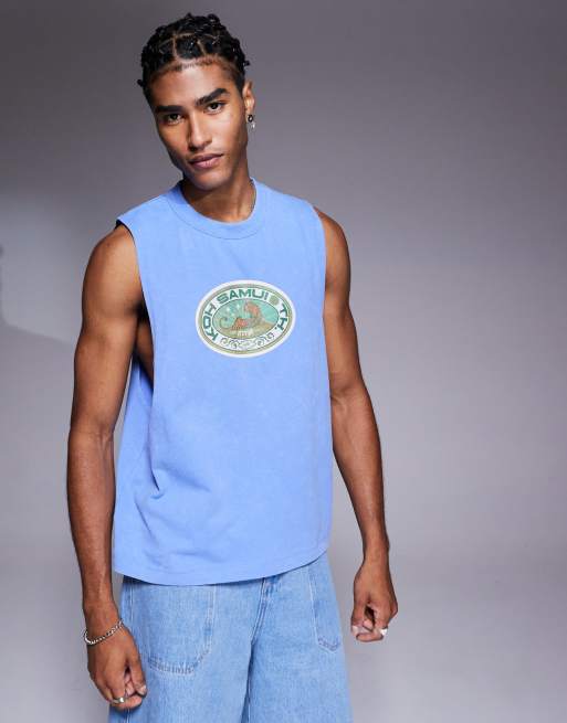 ASOS DESIGN heavyweight relaxed boxy tank in with front graphic in blue