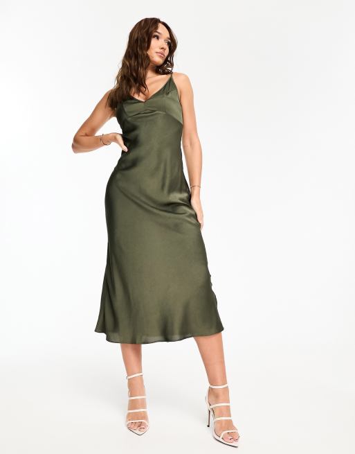 ASOS DESIGN high apex midi slip dress in hammered satin in dark olive