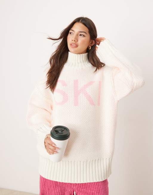 ASOS DESIGN high neck chunky sweater with ski slogan in cream