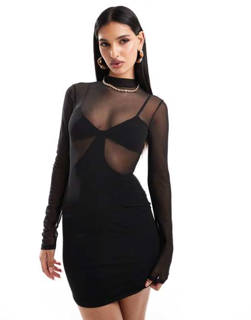 ASOS DESIGN high neck long sleeve mesh 2 in 1 mini dress in black