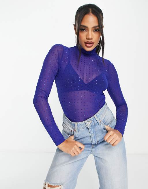 ASOS DESIGN hotfix crystal stud mesh bodysuit in blue