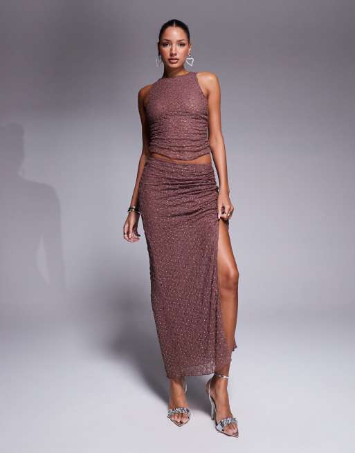 ASOS DESIGN hotfix lace tank top and maxi skirt set in chocolate