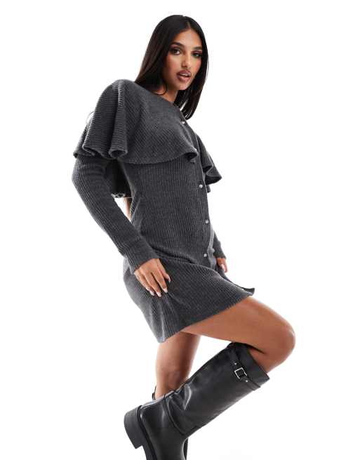 ASOS DESIGN knit cape button up mini dress in charcoal heather
