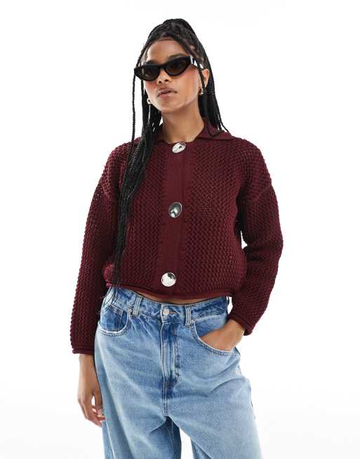 ASOS DESIGN knit collar cardigan in chunky stitch in burgundy