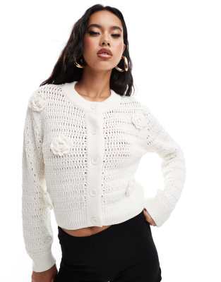 ASOS DESIGN knit crew neck cardigan in open stitch with crochet flower detail in cream