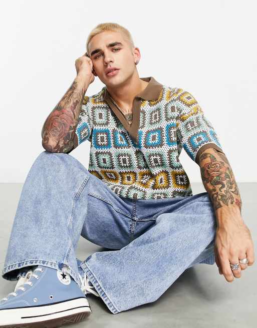 ASOS DESIGN knit crochet notch neck shirt with patchwork design