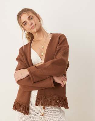 ASOS DESIGN knit edge to edge cardigan with fringe detail in rust