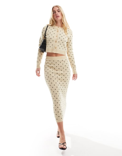 ASOS DESIGN knit jacquard button through cardigan & midi skirt in cream polka dot