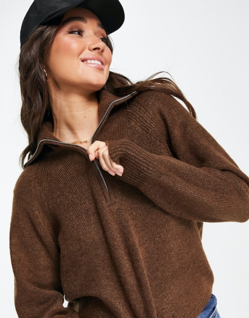ASOS DESIGN knit leggings & fluffy sweater with zip collar set in brown