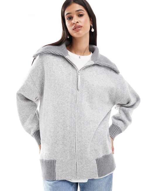 ASOS DESIGN knit longline bomber jacket with collar in gray