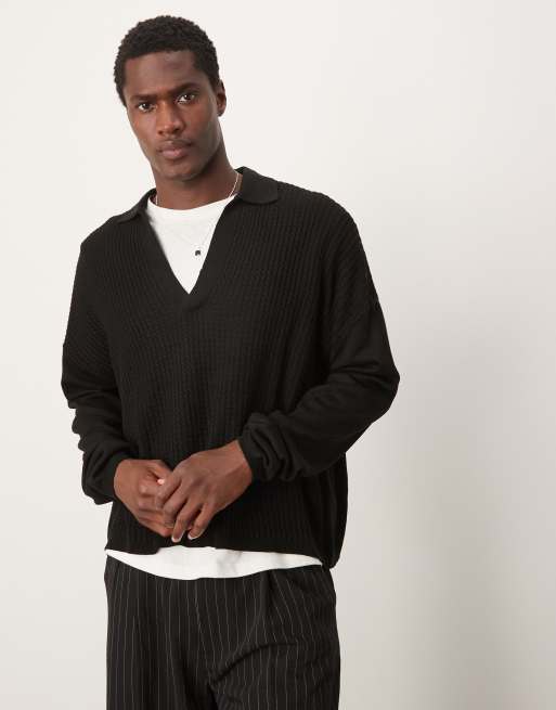 ASOS DESIGN knit oversized boxy long sleeve polo in black