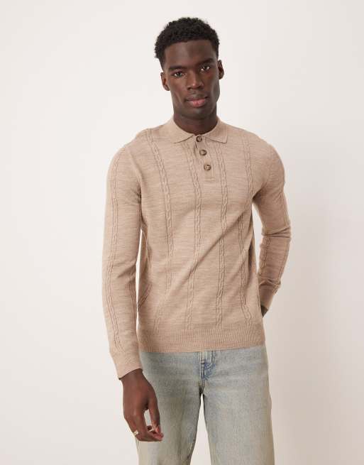 ASOS DESIGN knit polo sweater with cable knit stripes in stone