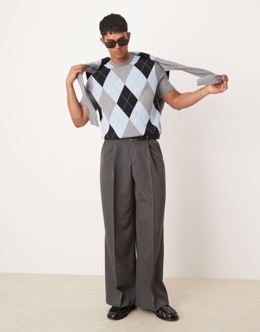 ASOS DESIGN knit relaxed boxy fit cardigan and t-shirt set with argyle pattern in blue