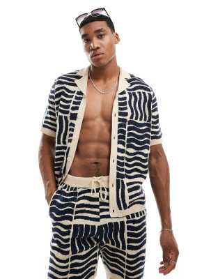 ASOS DESIGN knit short sleeve button through polo in blue pattern - part of a set